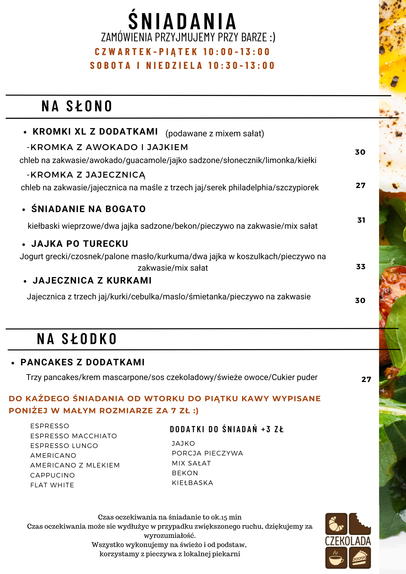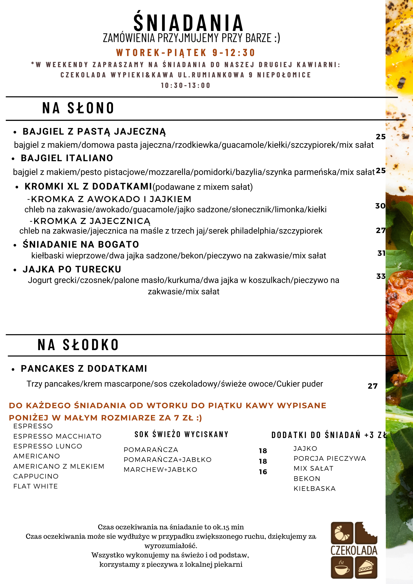 Zapraszamy również na ŚNIADANIA do Czekolady przy Rumiankowej 9 (od czwartku do piątku (10-13) i w weekendy (10:30-13:00) oraz na ŚNIADANIA do Czekolady przy Kazimierza Wielkiego od wtorku do piątku (9:00-12)